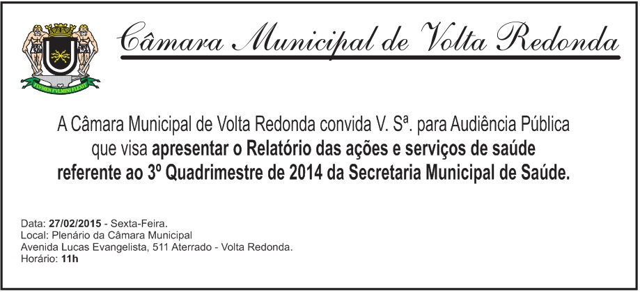 A Câmara Municipal de Volta Redonda realizará, em seu Plenário, no dia 27/02/2015, sexta-feira, às 11:00h, Audiência Pública sobre tema: Apresentação do resultado das ações e serviços de saúde referente ao 3º Quadrimestre de 2014 da Secretaria Municipal de Saúde.