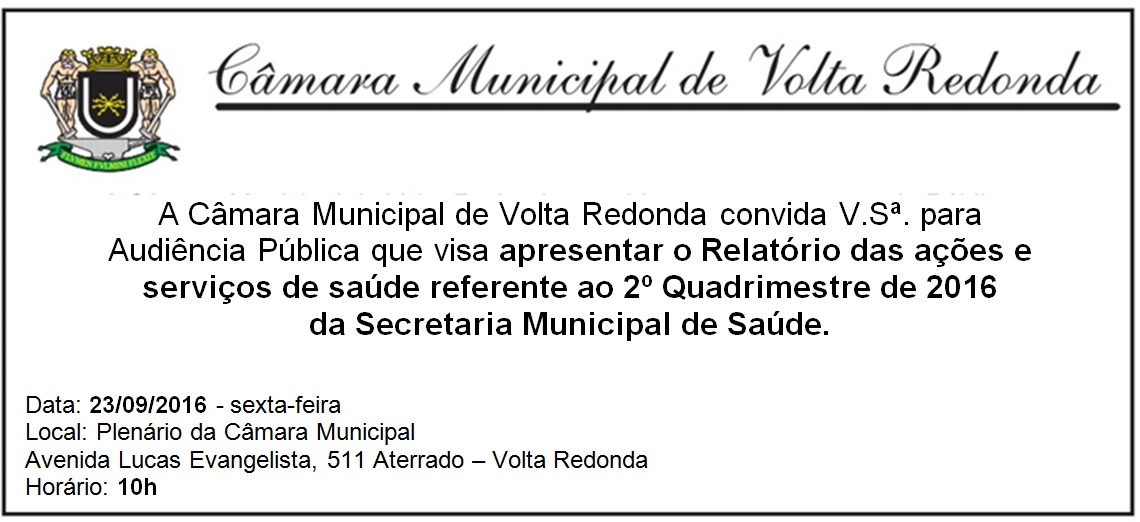 A Câmara Municipal de Volta Redonda convida V.Sª. para Audiência Pública que visa apresentar o Relatório das ações e serviços de saúde referente ao 2º Quadrimestre de 2016 da Secretaria Municipal de Saúde.