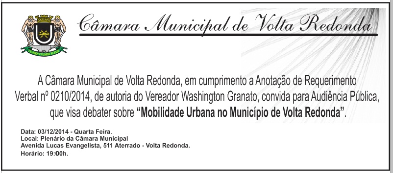 A Câmara Municipal de Volta Redonda realizará, em seu Plenário, no dia 03/12/2014, quarta-feira, às 19:00h, Audiência Pública sobre tema: Mobilidade Urbana no Município de Volta Redonda. Portanto, sua participação é muito importante.