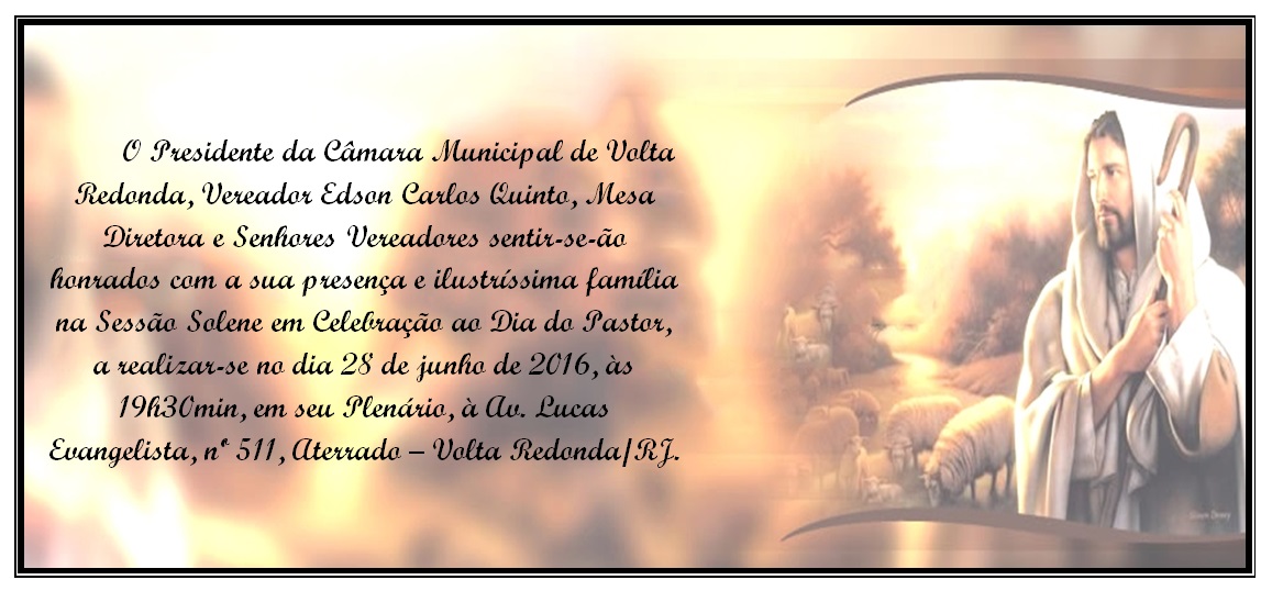O Poder Legislativo, através da Mesa Diretora da Câmara Municipal de Volta Redonda, sente-se honrado em convidar Vossa Senhoria e Ilustríssima família para a Sessão Solene em Celebração ao Dia do Pastor, a ser realizada no próximo dia 28 de junho, terça-feira às dezenove horas e trinta minutos, em seu Plenário, à Avenida Lucas Evangelista de Oliveira Franco, 511 - Aterrado - Volta Redonda-RJ.